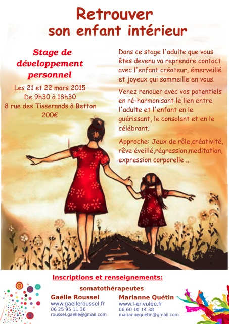 L'adulte que vous êtes devenus, sera invité à rétablir le dialogue avec l'enfant qui sommeille en vous, qui veut exprimer sa créativité, qui veux s'émerveiller et exprimer sa joie de vivre.